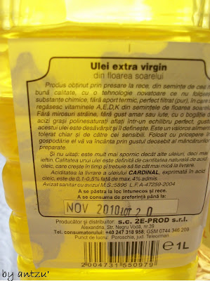 Am gasit astazi intr-un market de aici de la mine de acasa ulei de foarea soarelui presat la rece, gustul m-a impresionat, nu ma asteptam, are un gust fin si dur in acelasi timp, amarui placut de seminte de floarea soarelui, este bun, uitati si sticla: